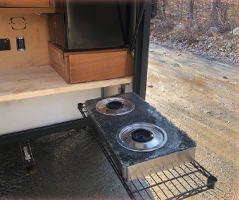 swing out propane stove for luxury of your cooking.Very spacius cabinets ,made of solid Mahogany wood ,that let you feel and cook in confort aof your home kitchen